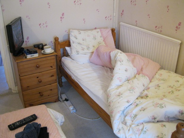 I slept with my legs hanging well over the end of the bed and my neck straining to watch the miniature TV, which was thoughtfully positioned on my bedside table so that it could be viewed from the double bed on the other side of the room. This meant that, to view the telly, I had to perform an act worthy of a skilled contortionist: to be fair, by turning my body sideways I found I did have a good view, not surprising really since my eyes were then only about 6 inches from the screen.