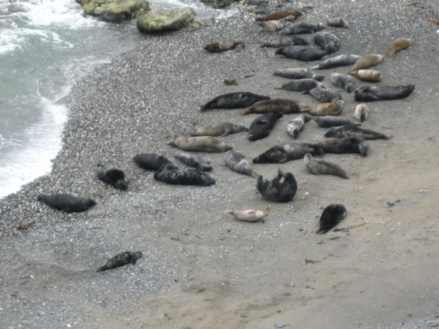 As I neared Godrevy Point, I began to notice more and more “casual walkers”; people who had strolled the few hundred yards from the National Trust car park. Many of these people were clustered along the cliff top looking down towards a cove. I realised why they were so excited when I saw over 30 seals, including many pups, swimming around or basking on the beach. I had only seen three seals since starting the walk in Minehead, so to see this number in one place really was special.